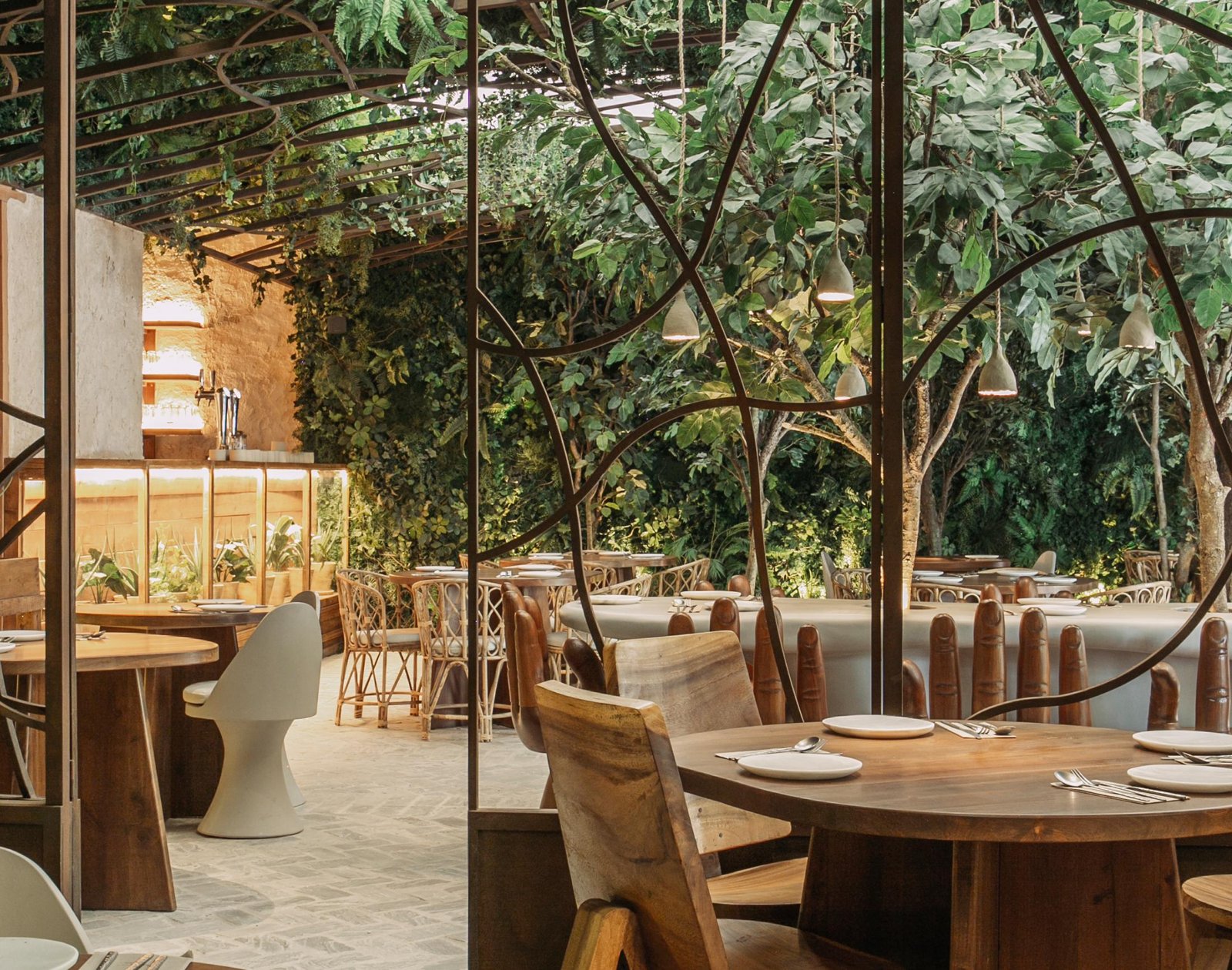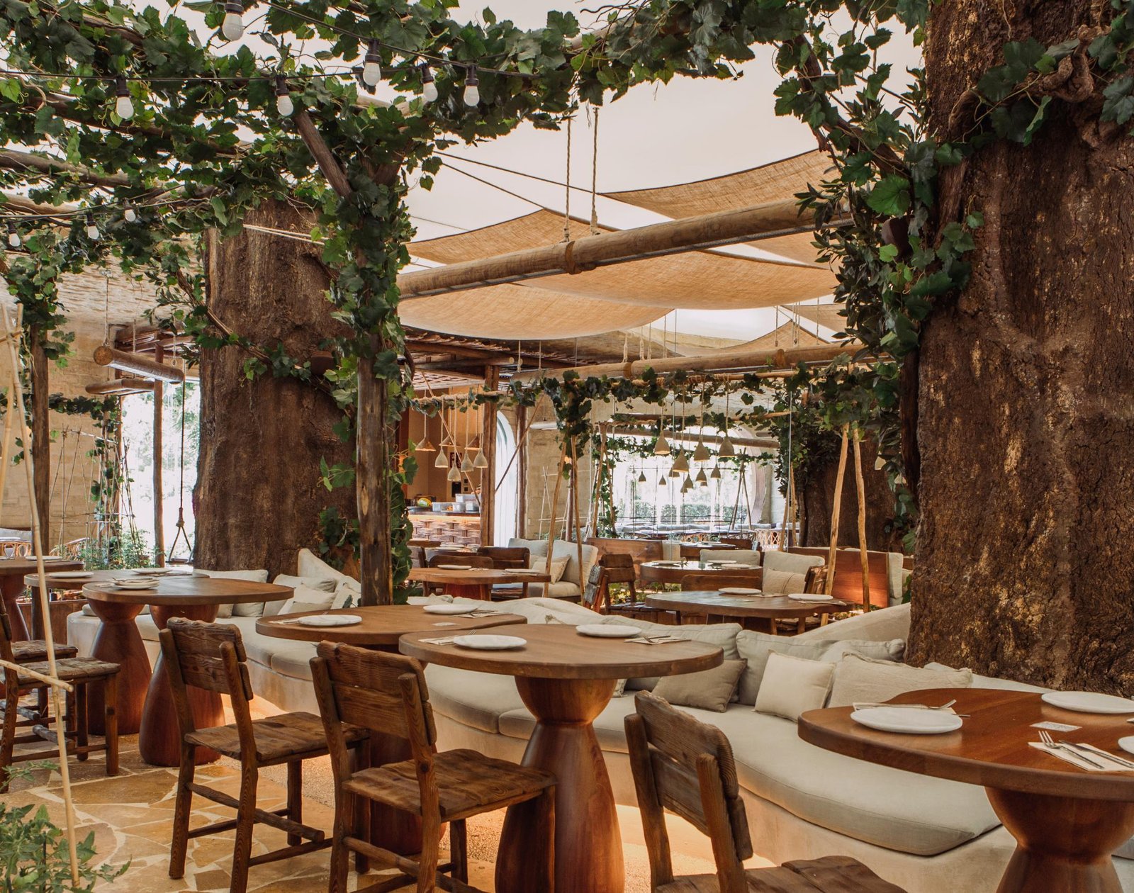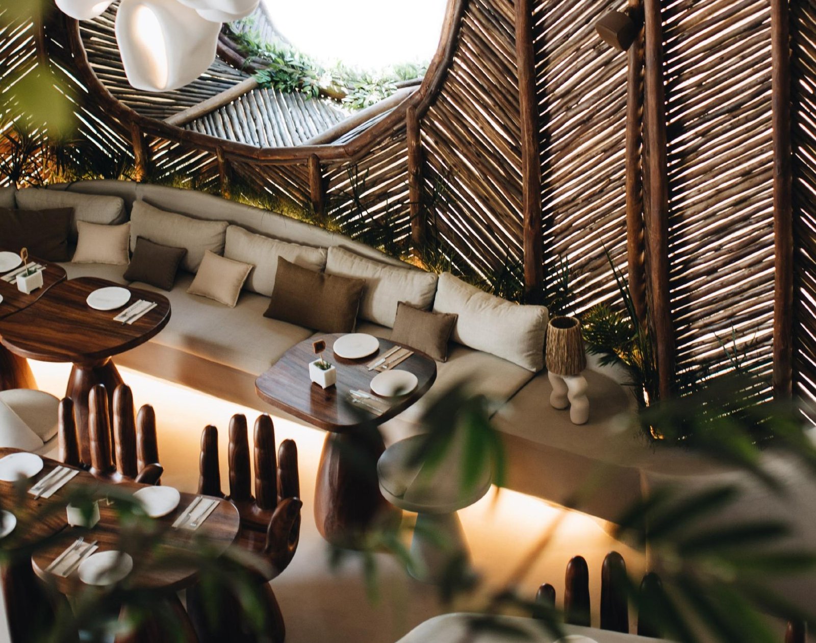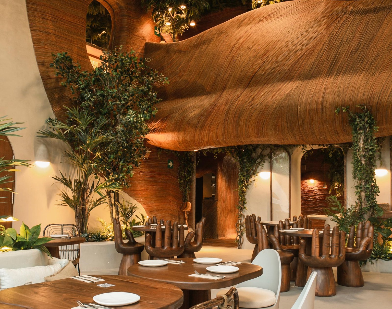Una cabaña de madera en mitad de la selva, construida artesanalmente con ramas de eucalipto.